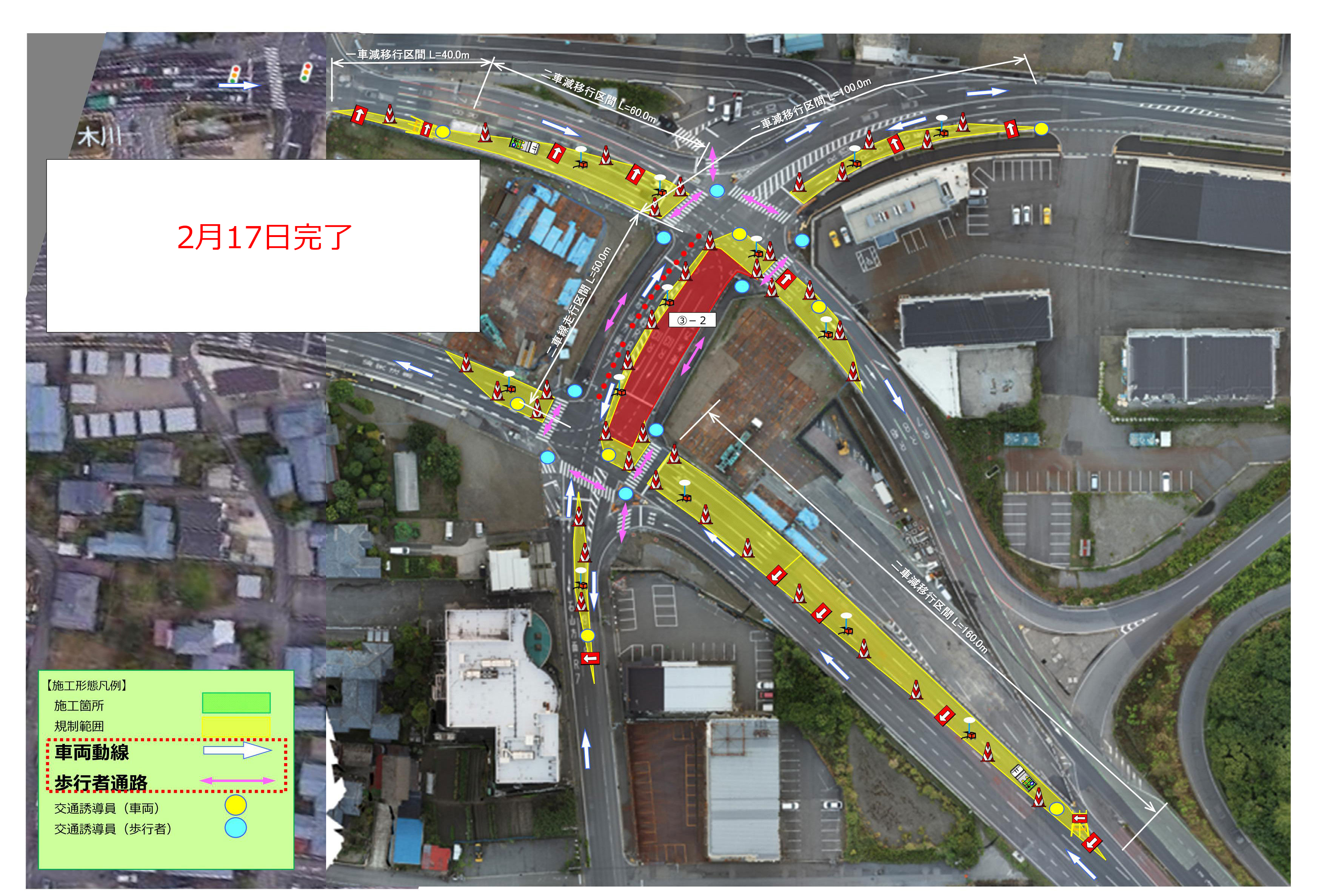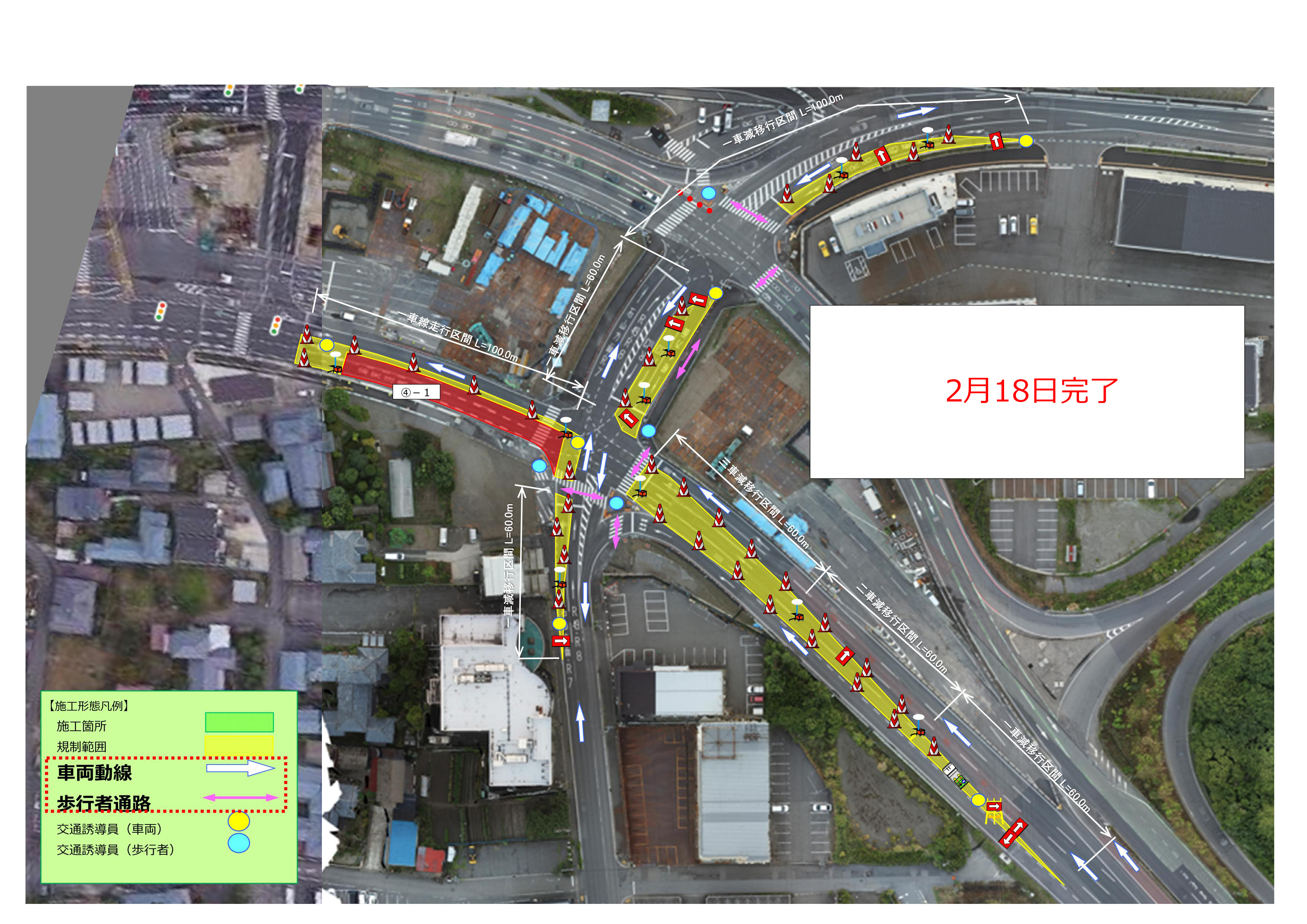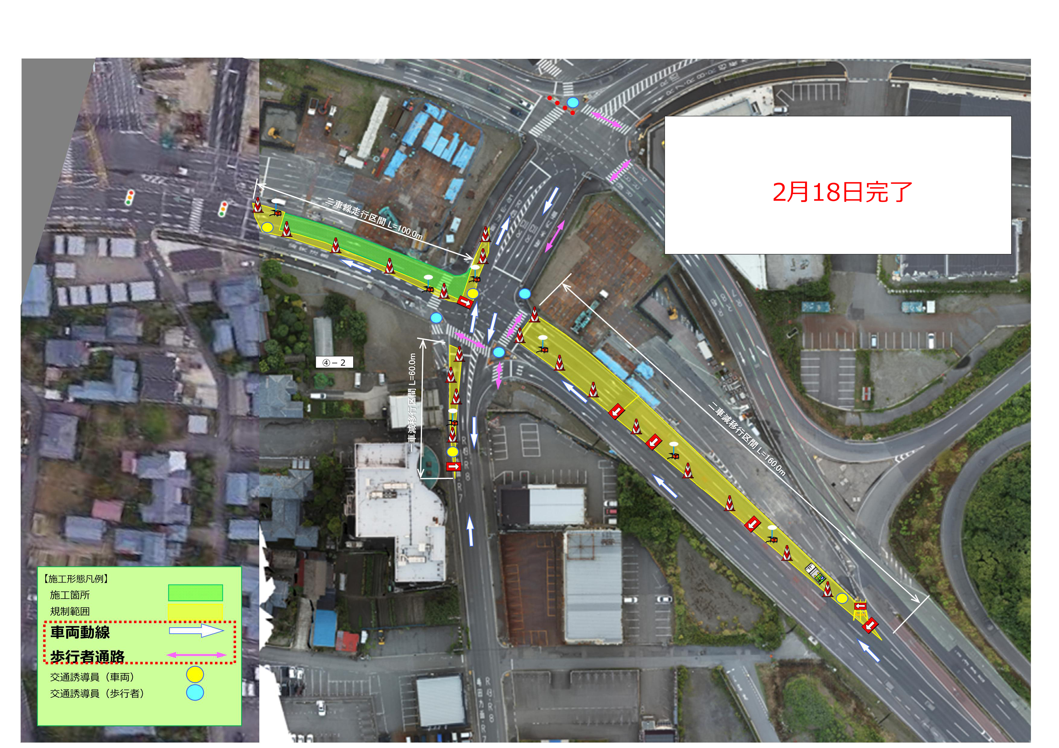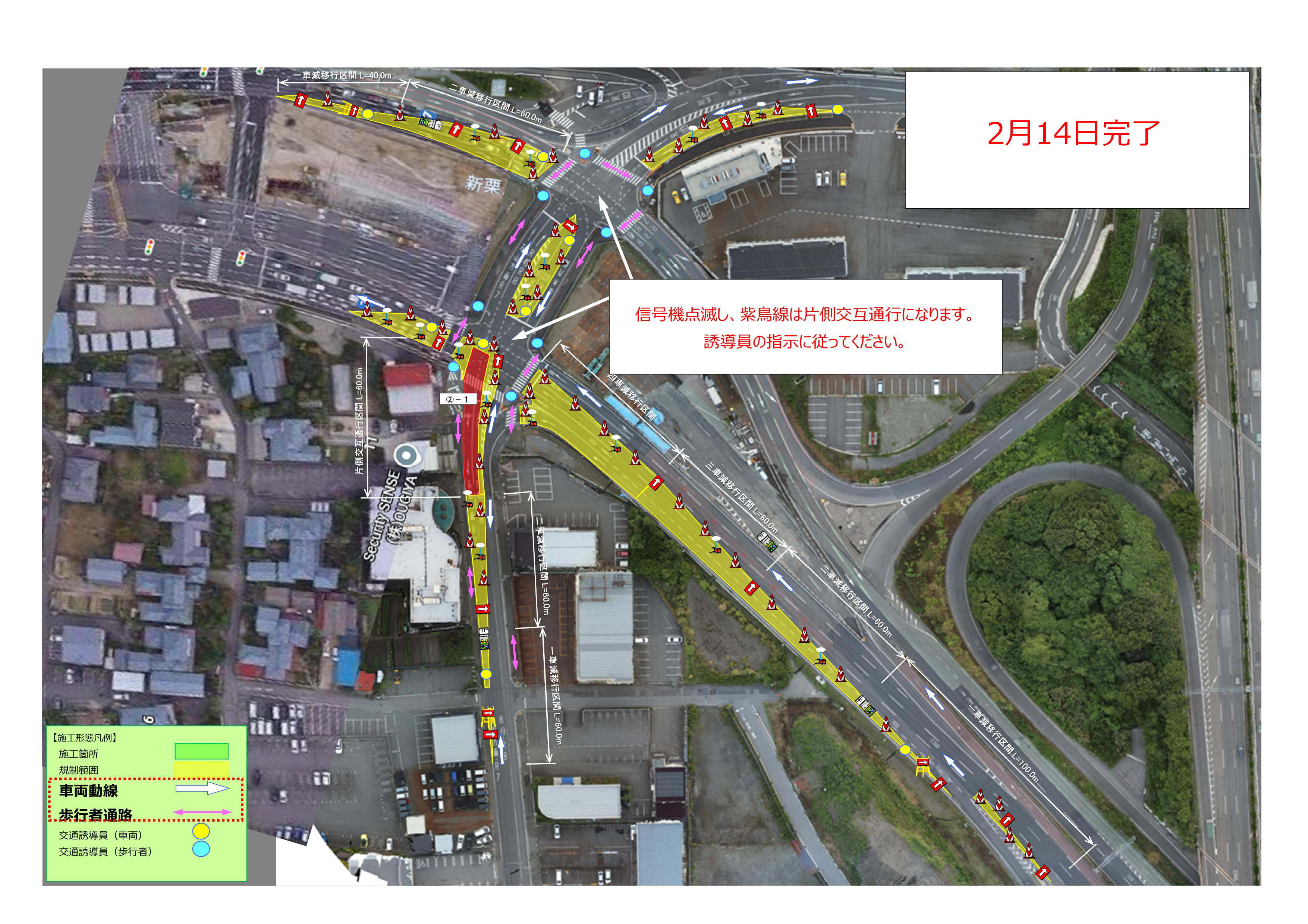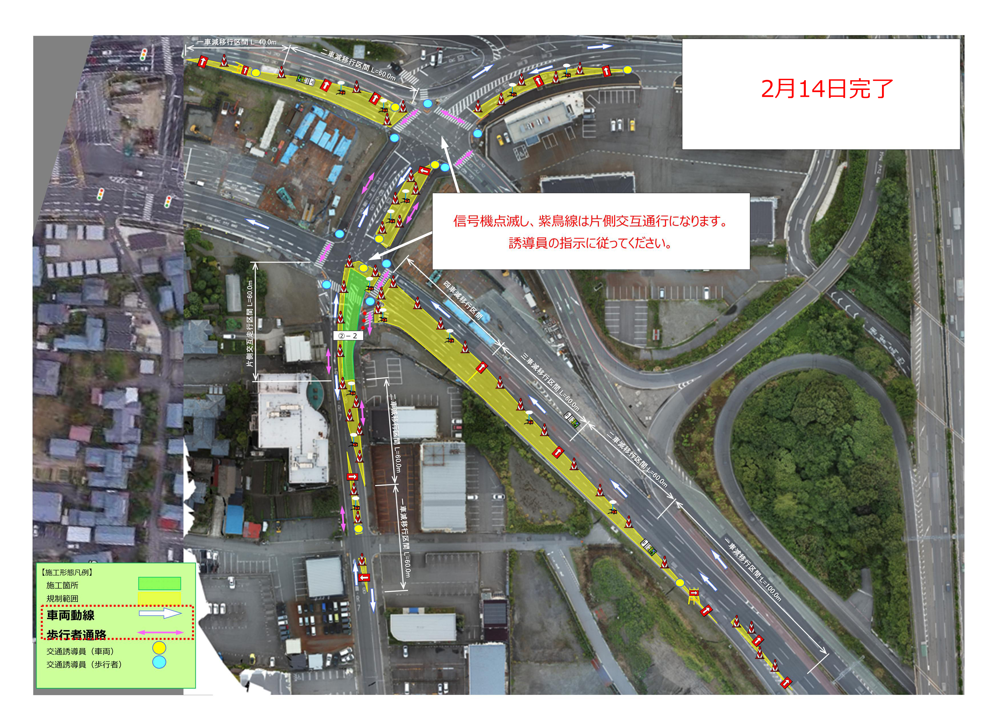 2月12日(木)から2月18日(水)の交通規制形態を下記にてお知らせします。なお期間は天候により順延いたします。ご通行時、交通誘導員の指示に従いますようご協力の程よろしくお願いします。