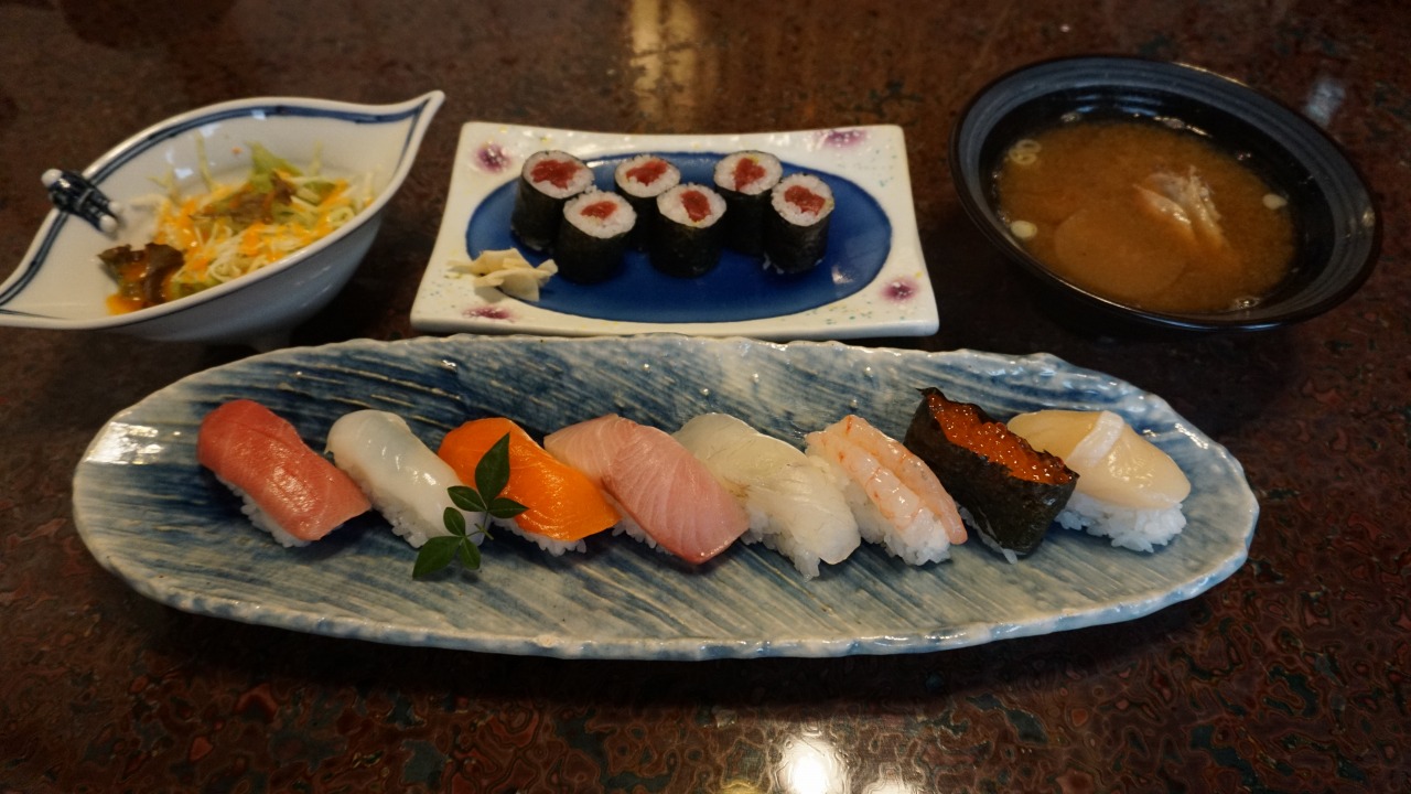 この日の握りのネタは、「トロ、イカ、サーモン、ブリ、平目、甘えび、いくら、ほたて、鉄火巻」+サラダと汁物