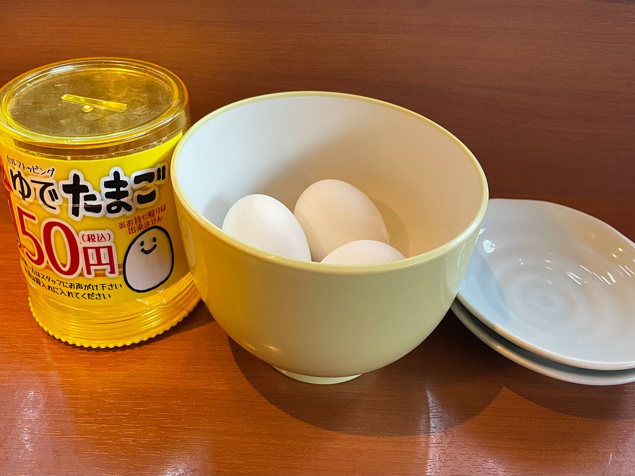 今回はトッピングに味玉を注文しましたが、席にはゆでたまごもあります。