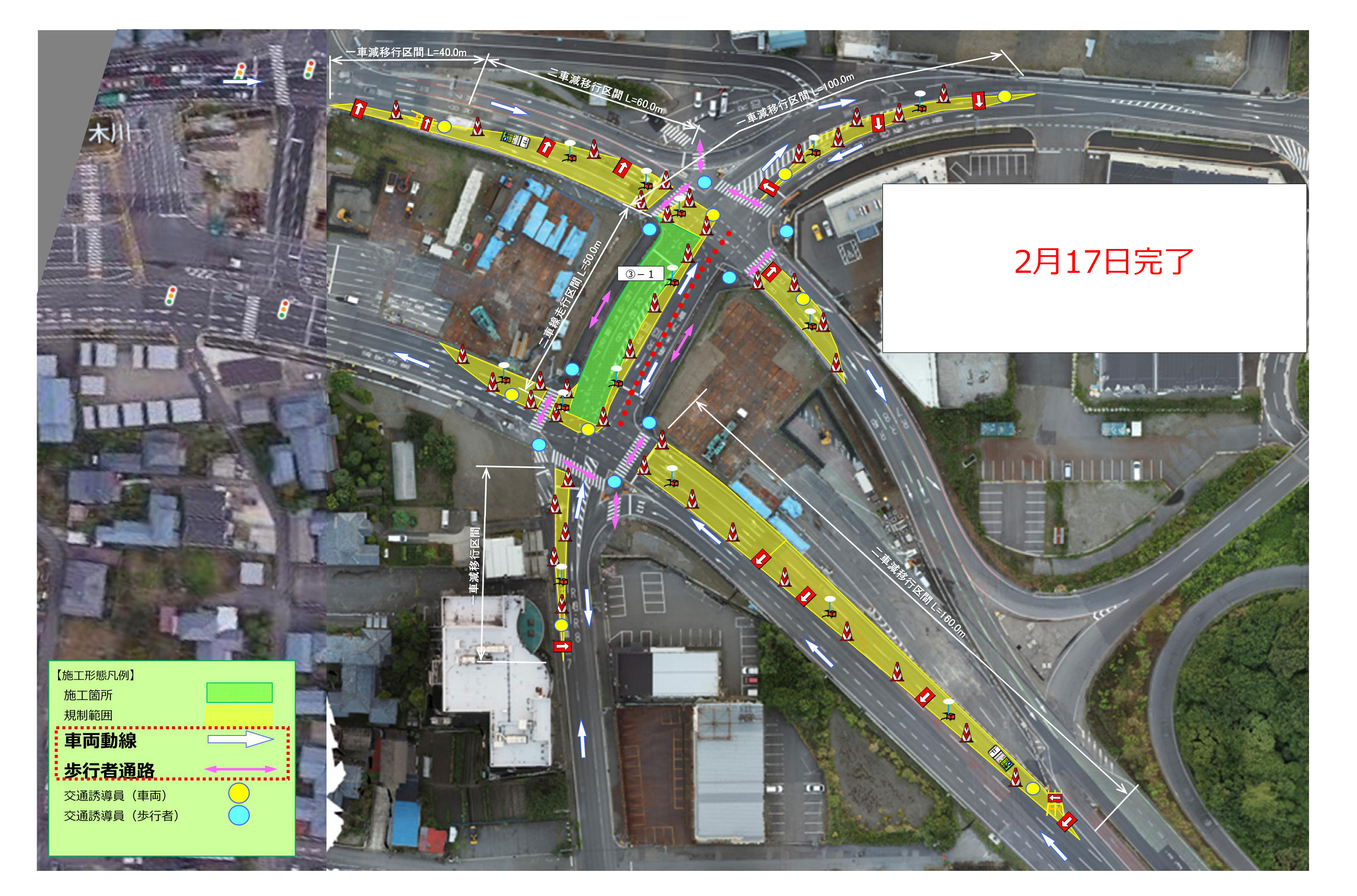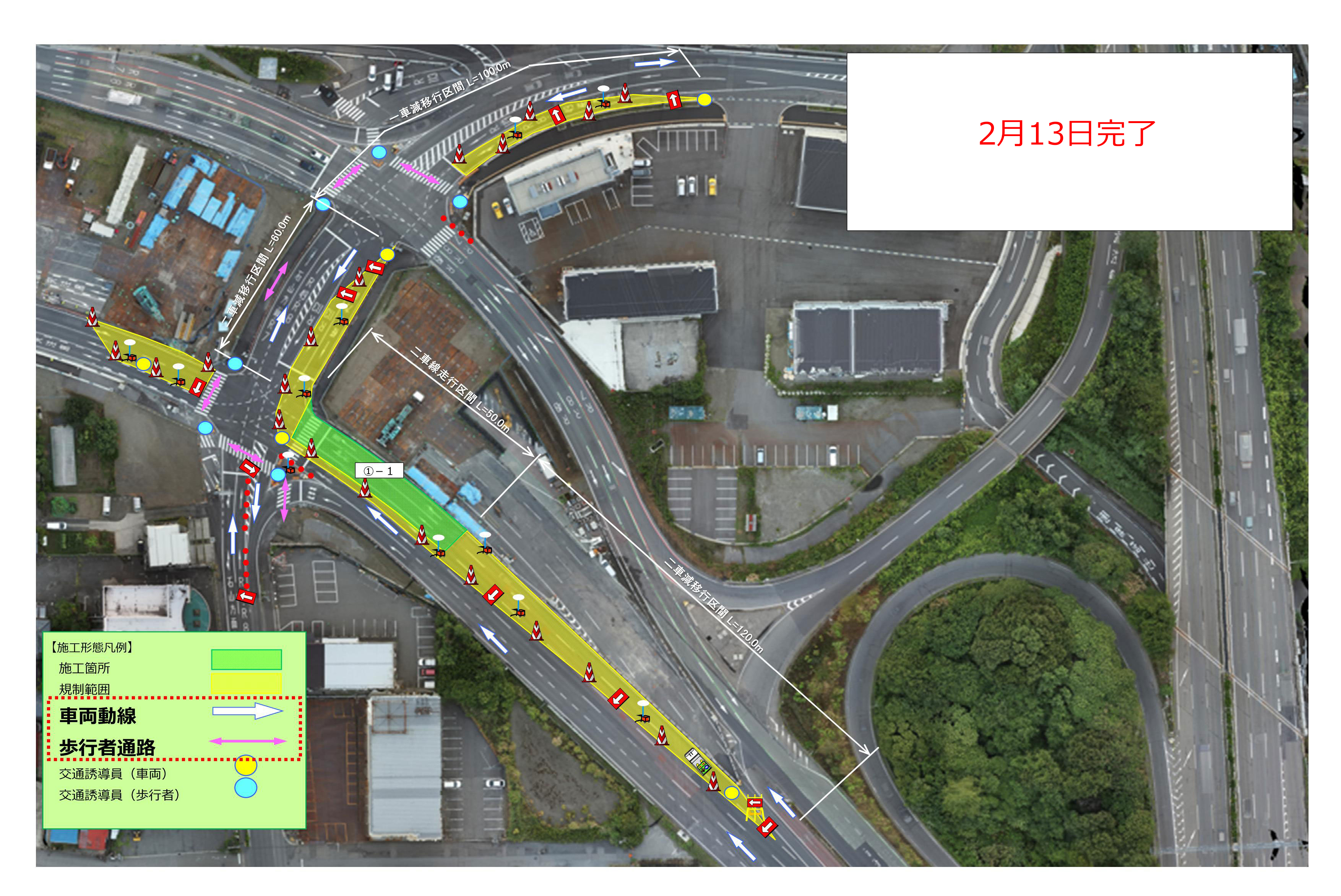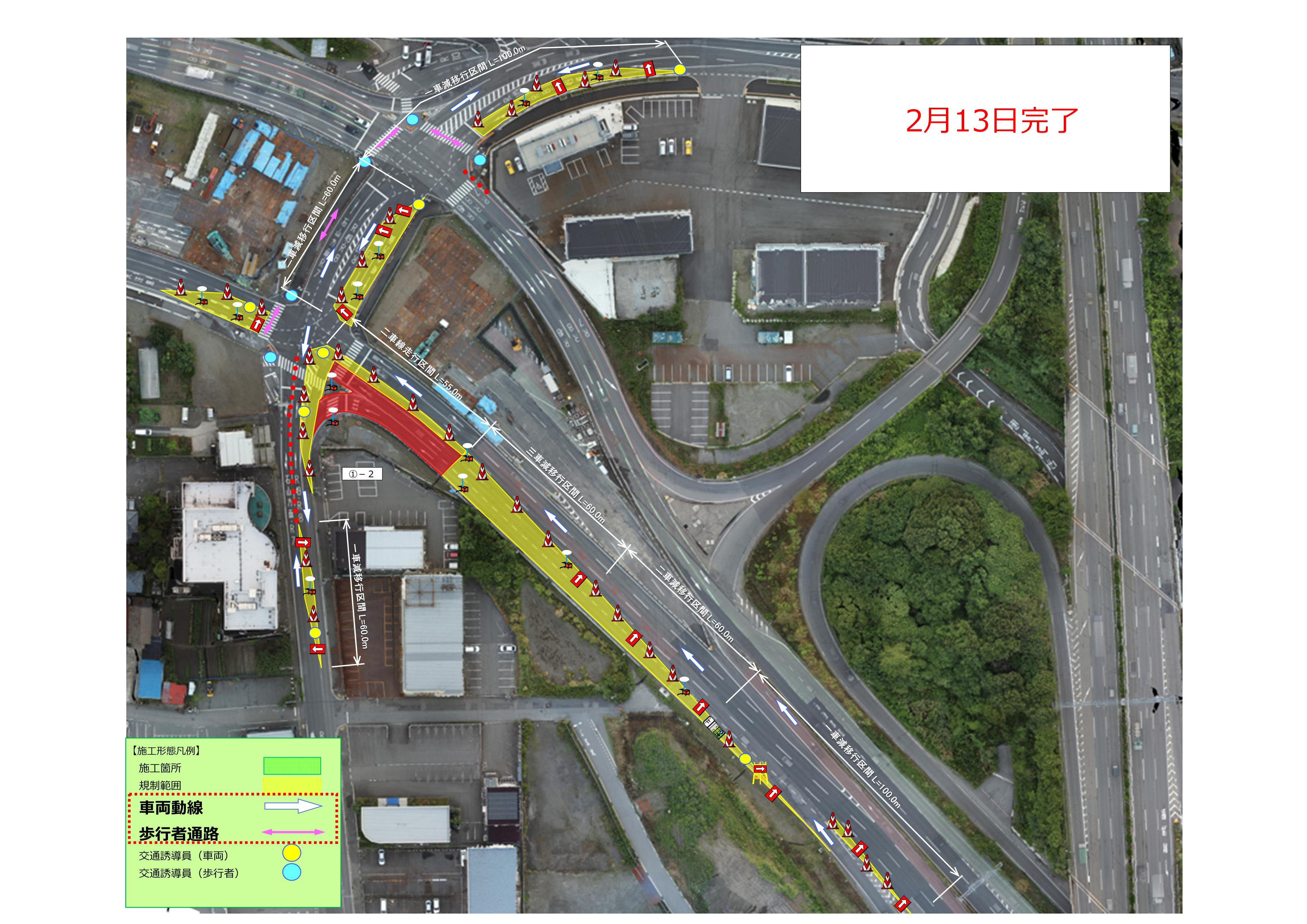 2月12日(木)から2月18日(水)の交通規制形態を下記にてお知らせします。なお期間は天候により順延いたします。ご通行時、交通誘導員の指示に従いますようご協力の程よろしくお願いします。